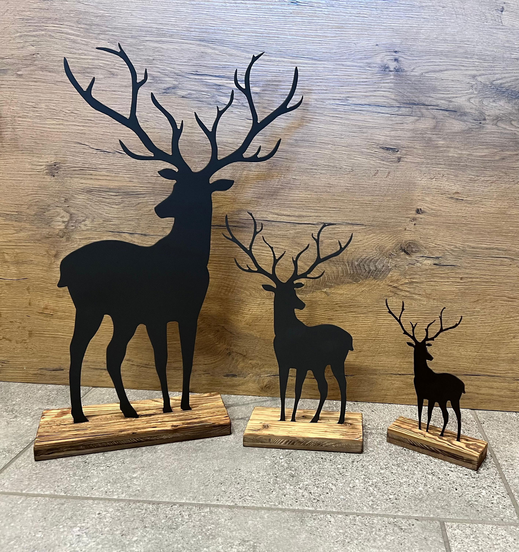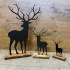 Dekorative Hirsch-Silhouette aus stabilem Metall, fest verankert auf einem massiven Holzsockel. Das Zusammenspiel aus natürlicher Holzstruktur und klarer Form schafft eine warme, ruhige Atmosphäre. Ideal für Fensterbank, Sideboard oder Eingangsbereich. Ein stilvolles Detail für alle, die Wald, Natur und zeitloses Design lieben. Verschiedene Größen verfügbar.